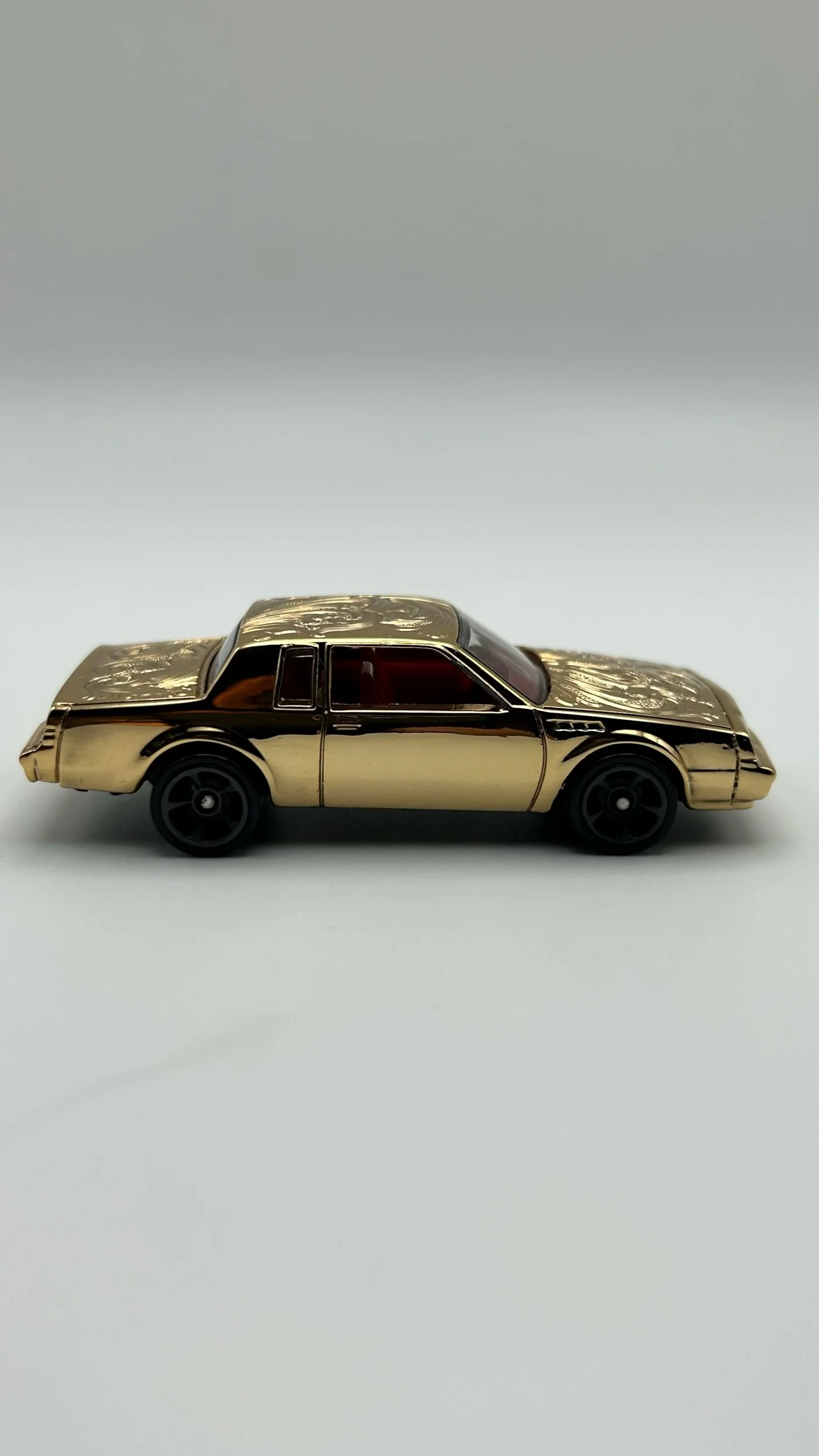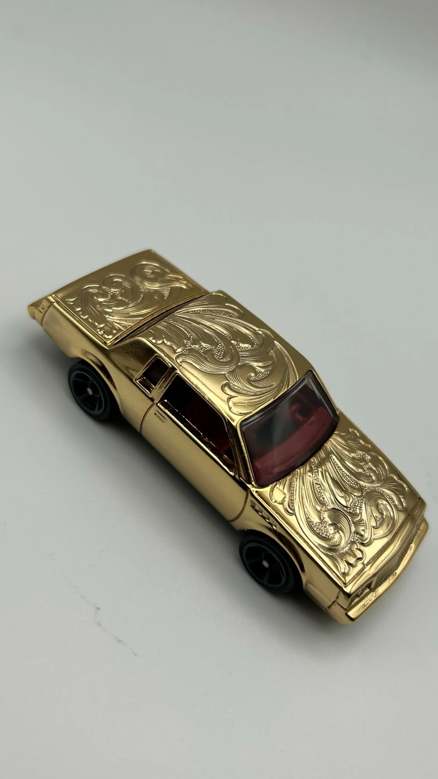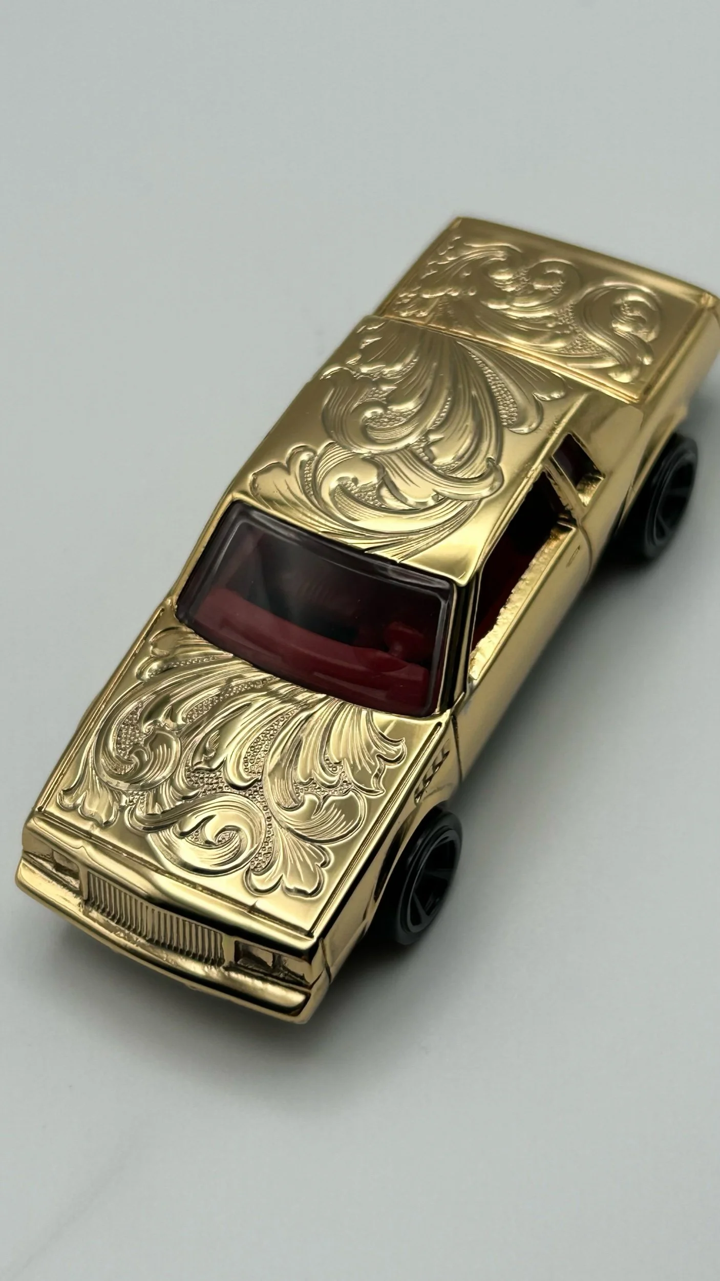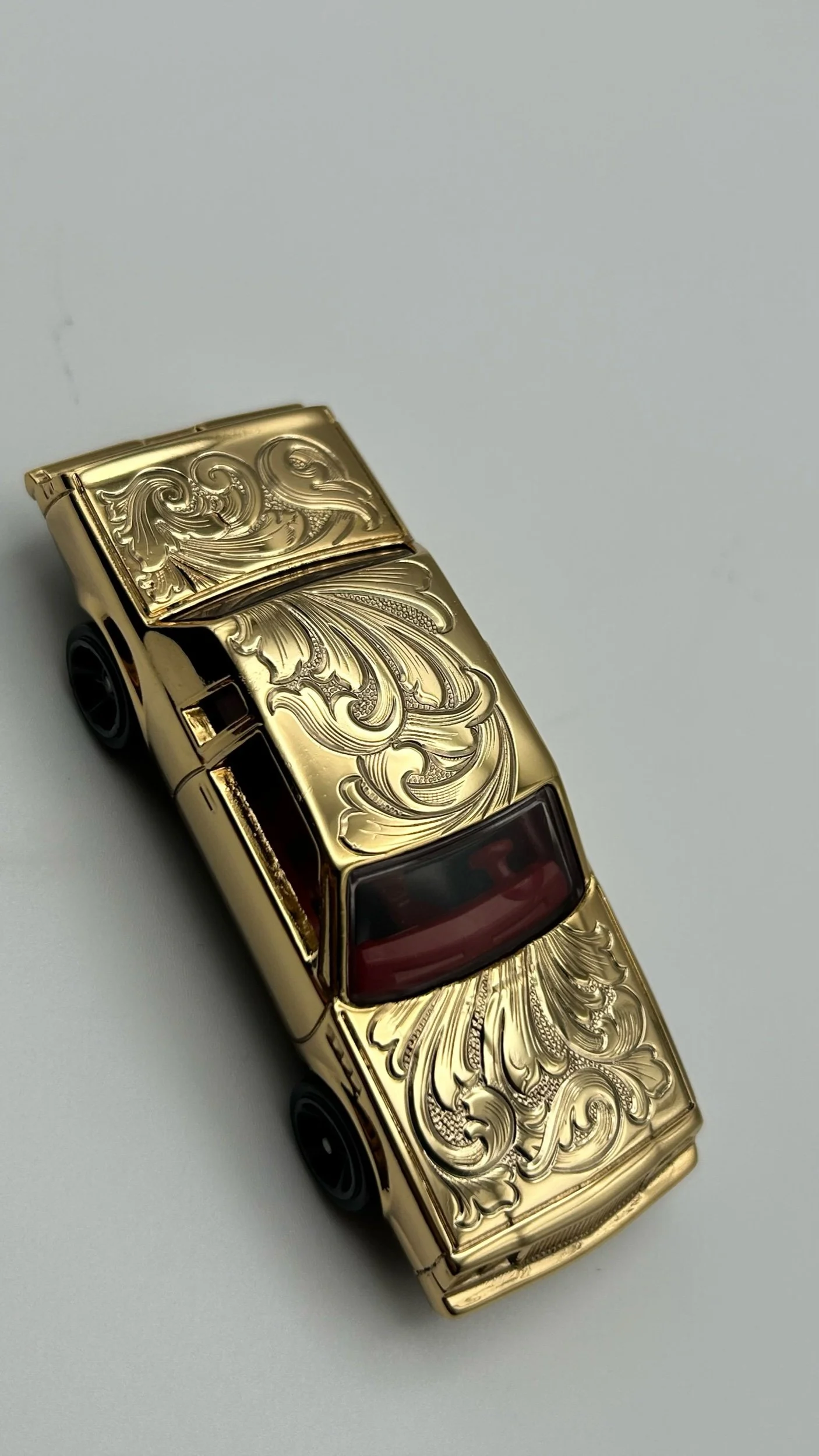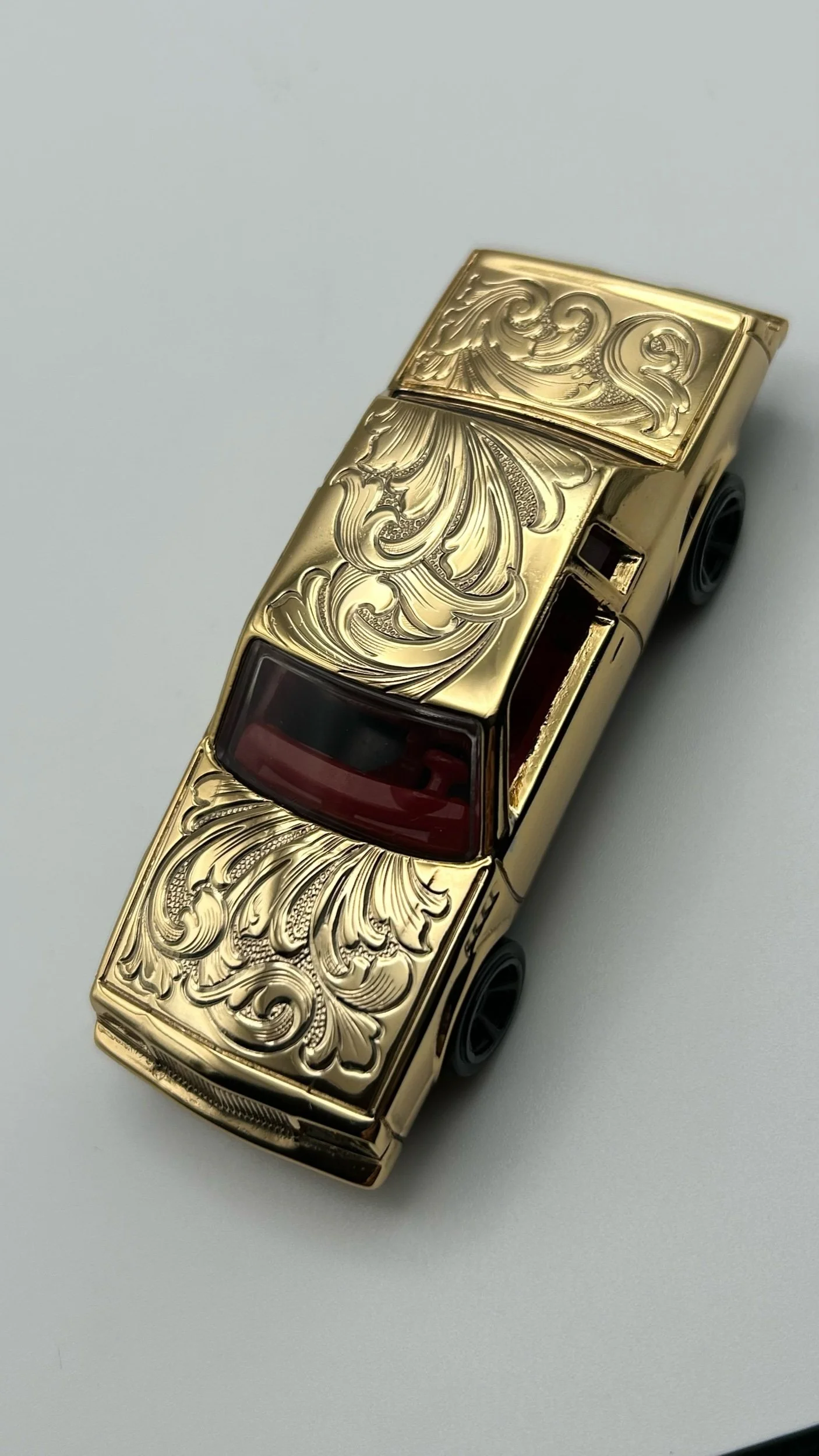 I engraved the roof, hood and the trunk of this 1987 Buick Grand National Hotwheel, with a flowing scroll design. I then added some dotted background texture, and gold plated it.